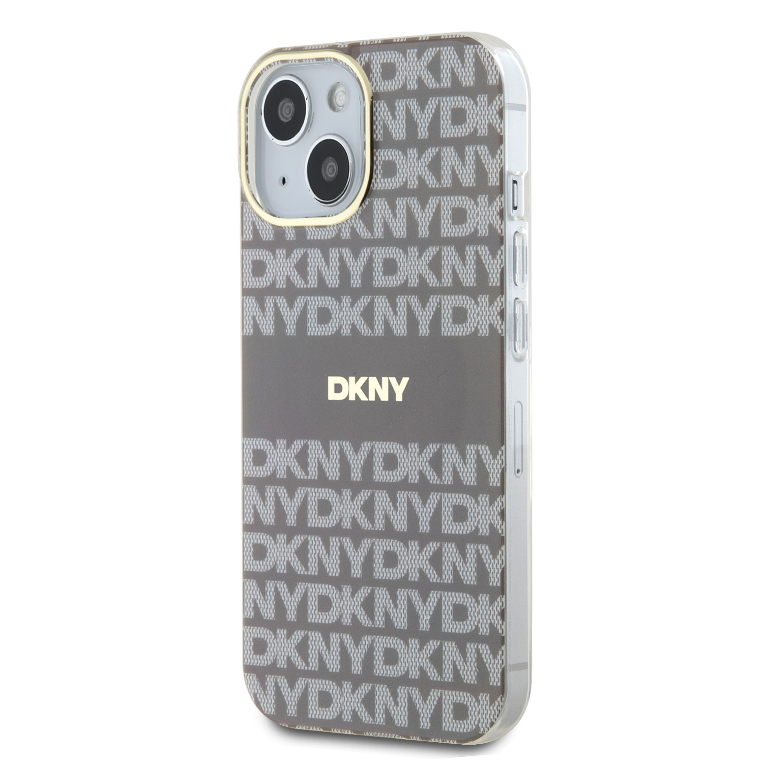 Design krytu telefonu má elegantní, moderní estetiku s opakujícím se vzorem loga "DKNY" po celé zadní straně a výrazným pruhem s nepřehlédnutelným ikonickým logem.